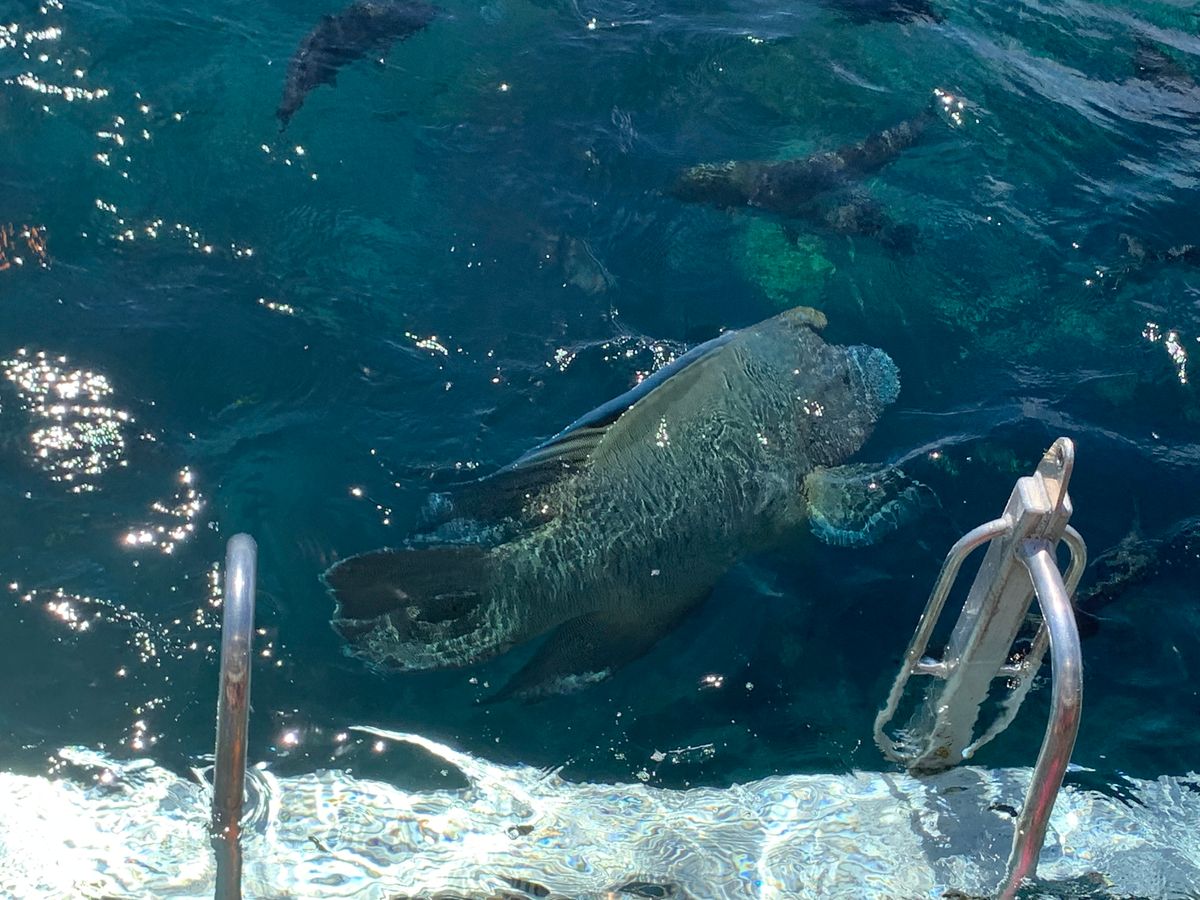海洋生物学者の餌付けショーは13:15前後に行われるのですが、ちょうどシュノーケル出発点となるプラットフォームにあるベンチに腰掛けることで、目の前にナポレオンフィッシュのウォーリー君を見ることができますよ。ただウォーリー君の体に触ると表面の組織が剥がれ落ちてしまうので接触は厳禁です。