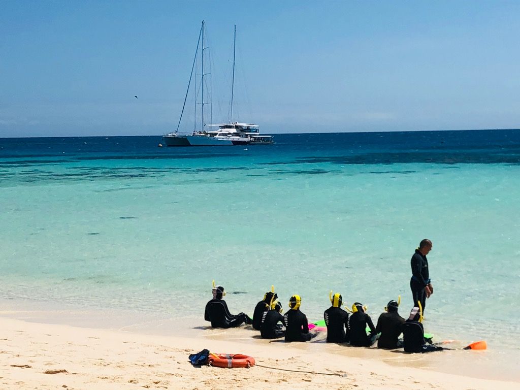 2019年8月7日にツアーに参加しました。ピックアップは時間通りに来てくださり、すぐにバスに乗り込みました。バスは各ホテルを回りました。ツアー参加者は60人程度で日本人と外国の方が半々というくらいでした!日本人参加者には日本人スタッフお2人が説明や対応に当たってくださりました。英語が苦手なため日本語での説明でとても安心しました!船では、ウエットスーツやシュノーケルセット準備をしました。フィン、マスク、シュノーケルは無料貸し出しでしたが、ウエットスーツは15ドルの追加料金が必要でした。水温が23℃程度であったため、ウエットスーツはかりておいて正解でした!寒さに弱い方や長くシュノーケリングをしたい方は借りるべきだと思います◎シュノーケリングはガイドさんの案内でサンゴの綺麗なところやクマノミがいるところを案内していただきました。ビーチから近い浅瀬はサンゴ礁が点々とあるといった感じでした!そのため、泳ぎの得意な方はその後の沖まででてシュノーケリングをするツアーに参加してサンゴ礁を見に行っていました!わたしは泳ぎに自信があまりなかったため、グラスボートで海の中を観察しました。私たちの時は半潜水艦ではなく、船の床の一部が透明になっているといったような感じでした!お昼はフルーツもあり美味しく頂けました。その後1時間程度の自由時間は辺りを歩いたり写真を撮ったりして過ごしました。supやカヤック、シュノーケリング、日光浴をする方など様々でした。お手洗いは島にはなくボートで沖に止めたトイレ付きの船まで行くためすぐに行くことはできないので注意が必要です!天気は快晴で、海はとても綺麗で、泳ぎが苦手でも浅瀬のサンゴ礁を楽しむことができました☺︎