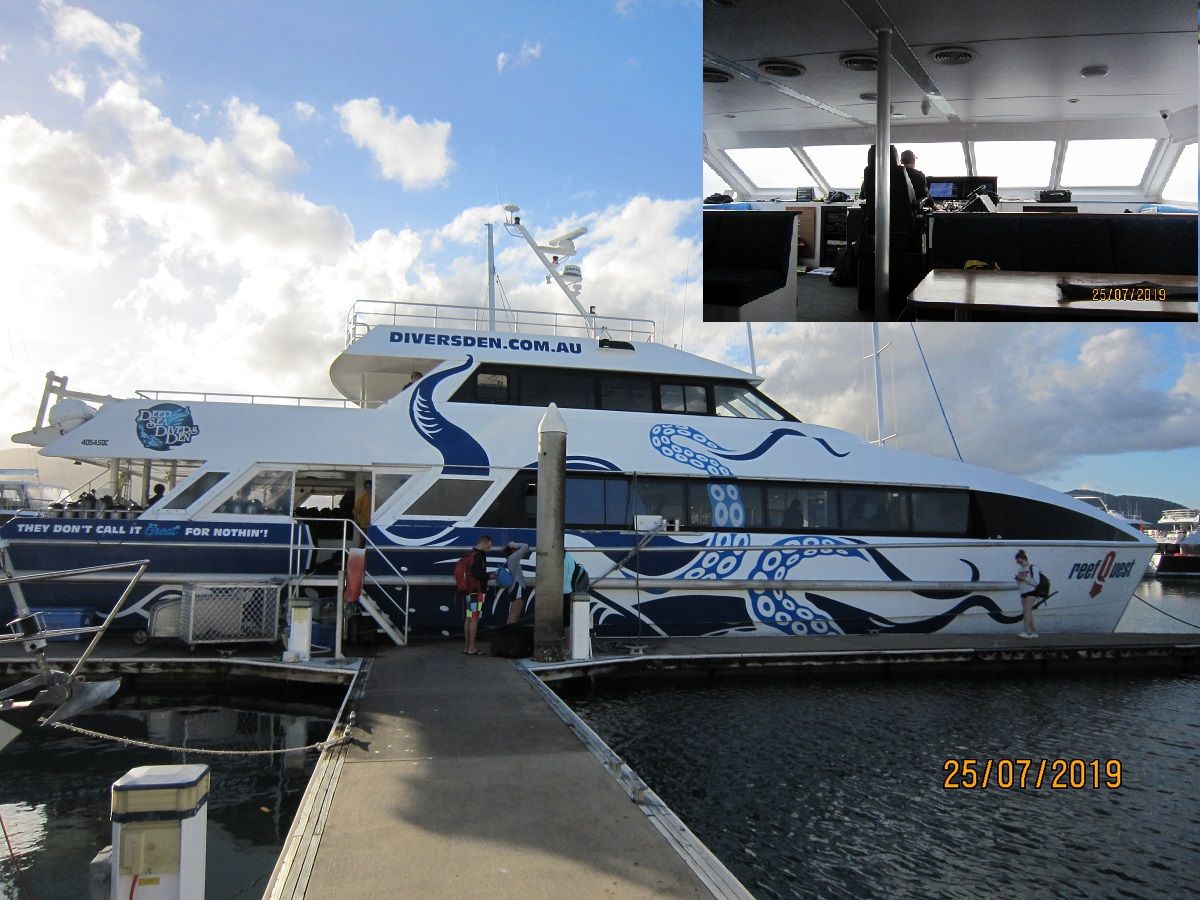 船の中でのグリーフィングは、日本人のナツキさんがとても分かりやすく、冗談も交えながら楽しく行ってくれ、私の不安も薄れていきました。しかし、この日は特に波が高かったためか、「170%酔いますから、気分が悪くなったら遠慮なく下に移ってください。」との言葉通り、説明の途中から10名以上いた日本人グループが最後には大半の方が途中離脱。私や主人は、日本から持っていった酔い止めが効いたのか、全く気持ち悪くならず、最後まで笑顔で話が聞けました。スタッフの方にも不思議がられていました。(笑)