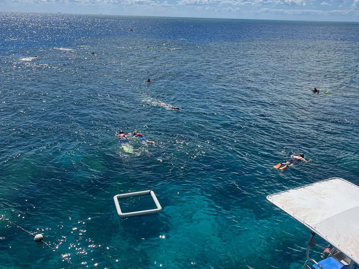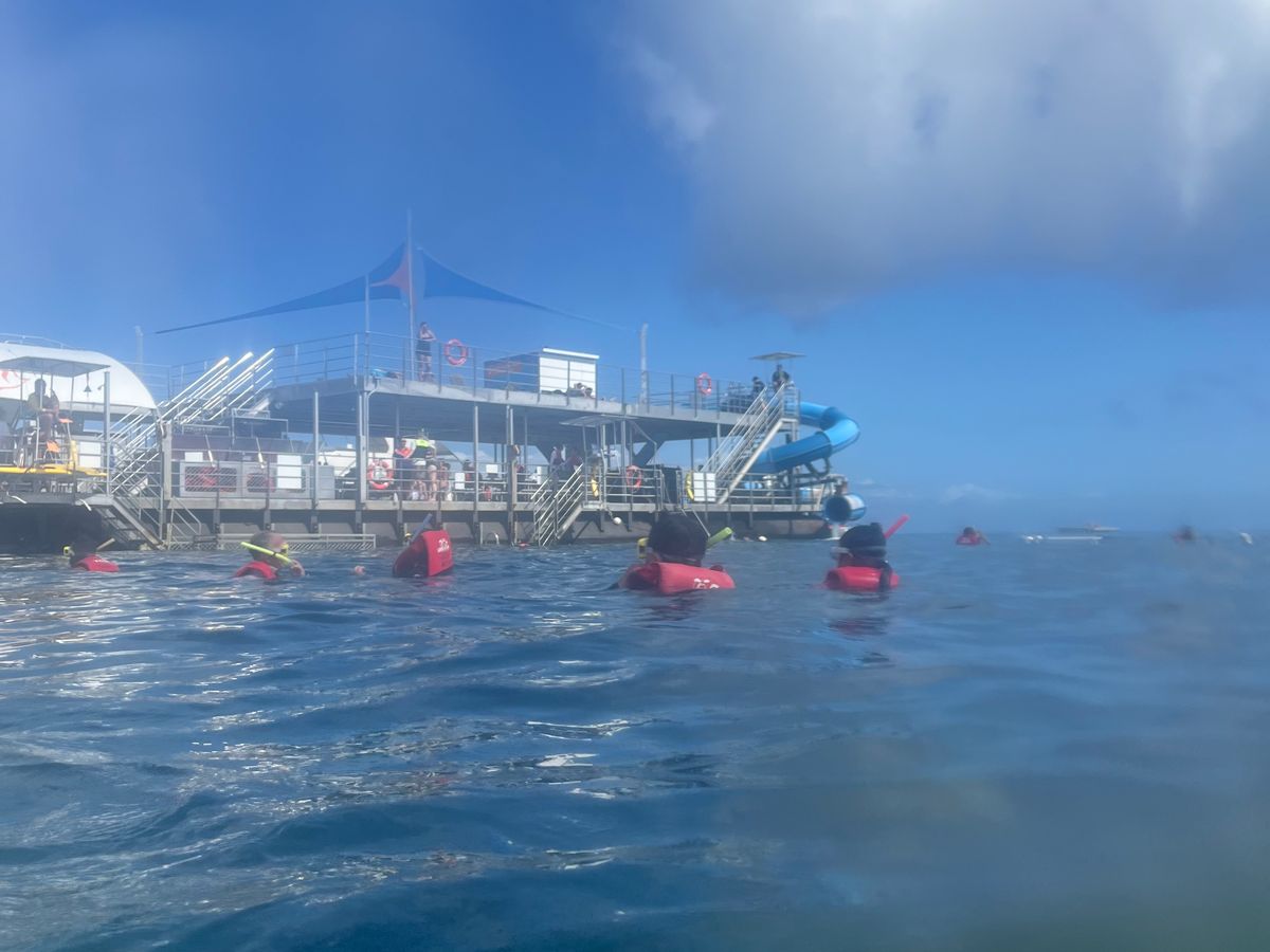 風の強い日だったこともありアウターリーフまでの船がすごく揺れ、酔ってしまう方がたくさんいました。酔い止めを飲んでおき大丈夫でした。8月の初め、海水が冷たくシュノーケリングは20分くらいで子どもがギブアップでした。それでもいろいろな種類の魚がたくさん見られました。