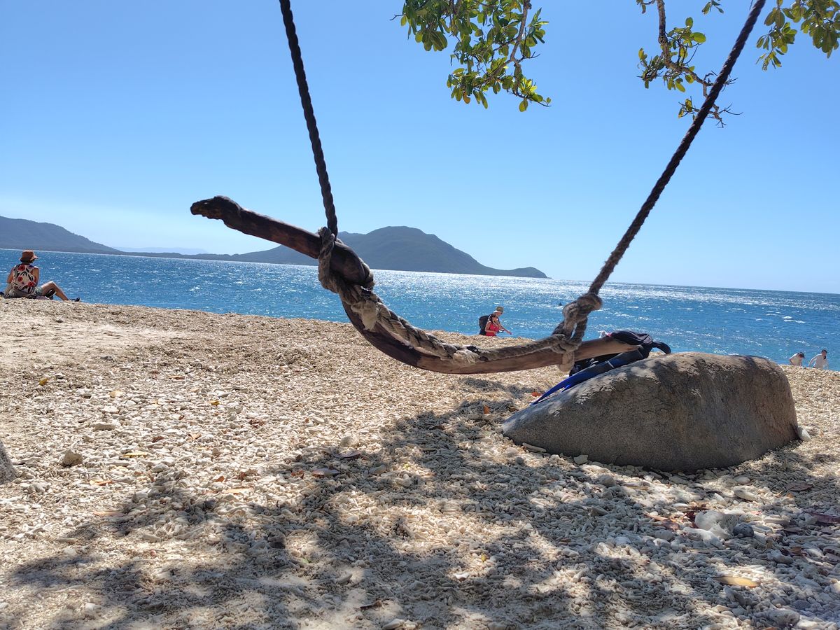 フィッツロイ島のビーチは砂浜ではなく珊瑚礁の欠片が広がってるので、座る様に敷物を持っていくとよいです!直座りだとかなり痛いです!