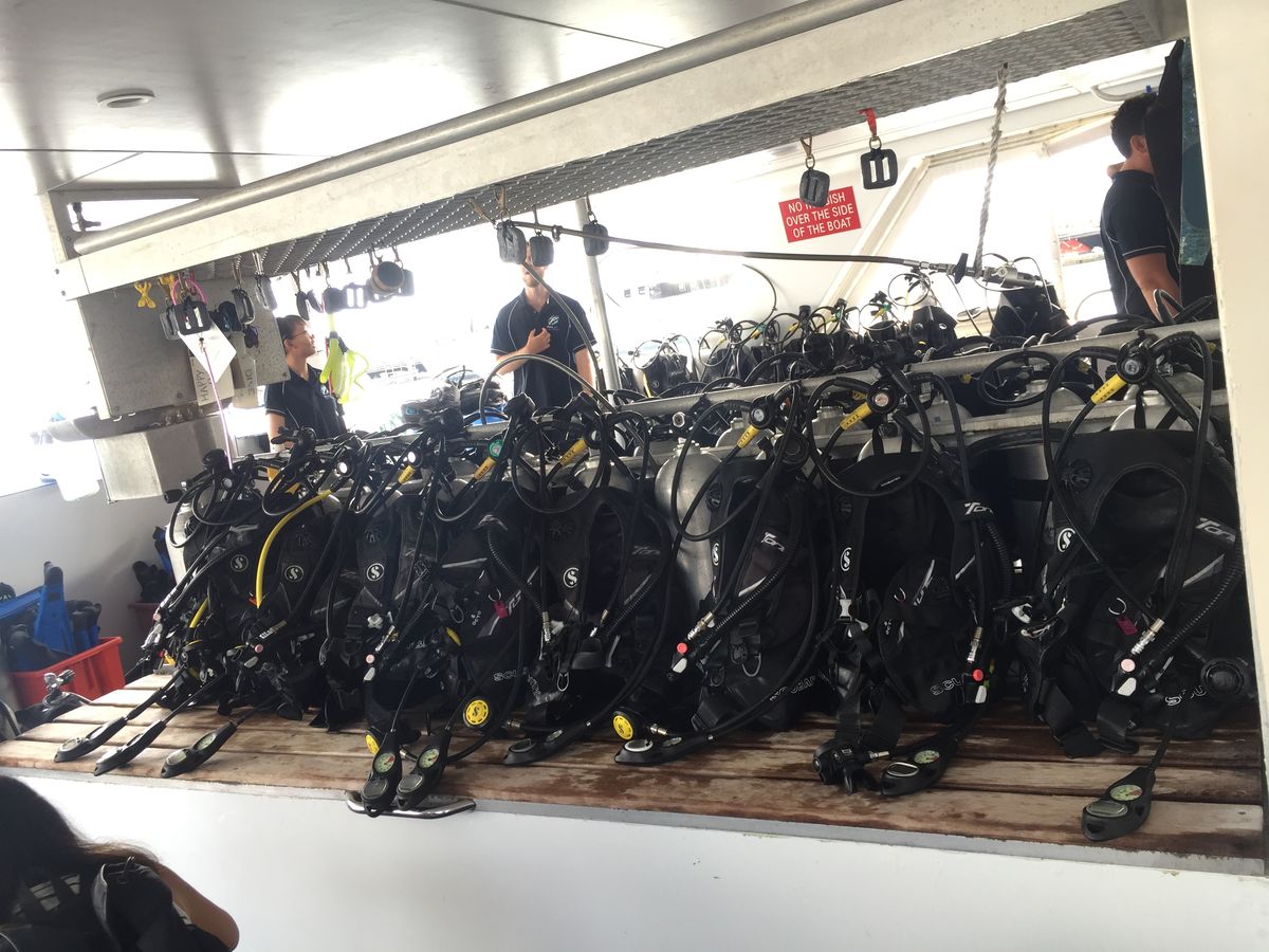 ベルトラのバウチャーではC埠頭とありますが、実際はB埠頭でした。何回もC埠頭の先に行ってうろうろしちゃいました。参加する前に船の名前(会社名)を探して確認したほうがいいです。酔い止めは必ず飲んだ方がいいです。ゆれます。船のなかは裸足。参加者がたくさんいましたが、セキュリティは少し安心できませんので自分で対策を。ダイビング説明などしっかりしてくれるので不安は解消されます。1ダイブは海のキレイさに感動し、2ダイブは魚の大きさと種類の多さに感動。ご飯を食べて3ダイブは慣れてきてインストラクターさんのパフォーマンスに海のなかで何回も笑っていました。3ダイブだとシュノーケルをやる時間はないのでシュノーケルも楽しみたいなら2ダイブにしておきましょう。