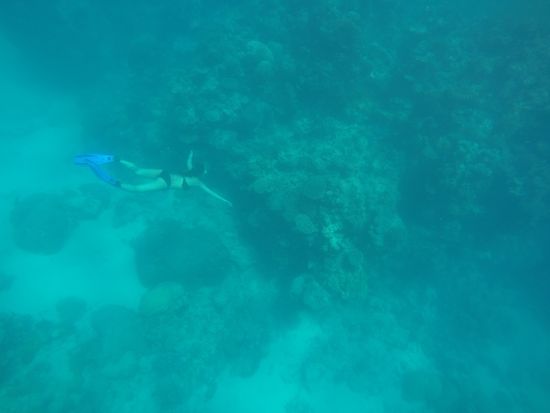 見える景色は、ポンツーンまわりとぜんぜん異なり、カラフルで、白化がおきていない、きれいな珊瑚を見せてもらえます。ドロップオフに沿って巨大な珊瑚地帯を案内してもらえますので魚も見れます。見えてる景色が良いせいか、場所によってはポンツーン周りより浅く感じるところも多かったです。