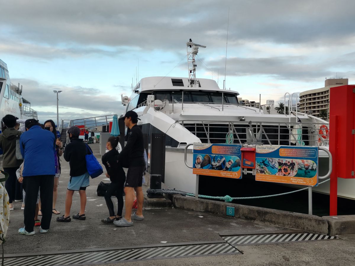 チケットを交換し乗船したが、日本人スタッフから何か声掛けがあったりするのかと思っていると全くそのようなことはなく、船内を探してようやくスタッフを見つけて話しかけても「追加オプションを予約しますか?」と言われしないというとどこかに行ってしまった。船内ではすべて英語の説明でなんとか理解できるように努力して耳を傾けた。英語が苦手だったし正直日本人スタッフがいると書いてあると安心すると思うし日本語でのサポートが有ると勘違いすると思うのでもう少し説明なりしてくれるとありがたいと思った。グリーン島に到着してからもアウターリーフに行きたい人はかなり時間が短い&あらかじめ想定はしていたが日本の海水浴のような設備が整っていないためグリーン島にてシュノーケルをするのはとても難易度が高いと思った。ひとりだったこともあり島に取り残されるのではと思いかなり不安になった。そのような感じでしたが、なんとかアウターリーフに行くことができたのだが、一人だったこともありスマホやカメラの盗難されるのを心配するあまりシュノーケルは諦めてしまった。とりあえず海は綺麗で良かったですが、英語に自信がない人は一人で行くのはおすすめしません。