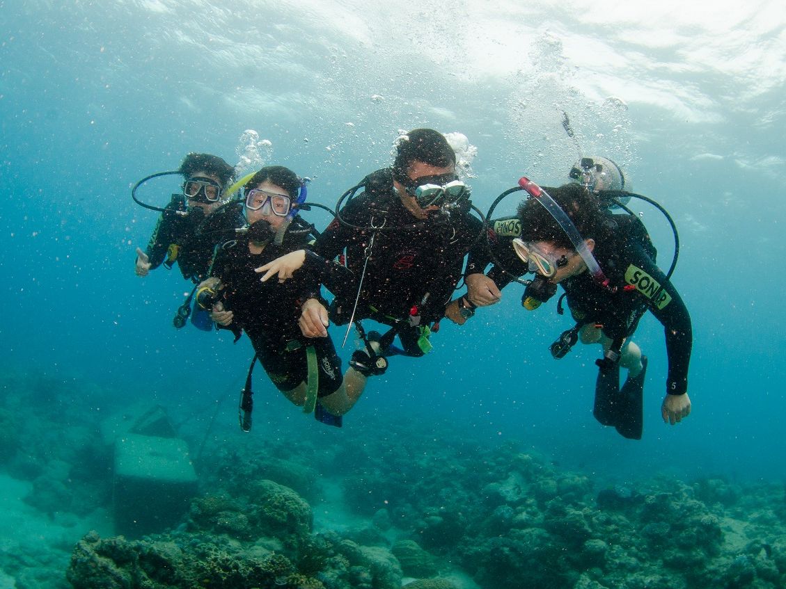 本日の体験ダイビングは、4人グループに分けられ、順番にダイビングを行いました。私たちは、3グループになり先にシュノーケリングを行い、30分後位に船に戻りダイビングの準備を行いました。このシュノーケリングだけでも、ものすごく感動しました。