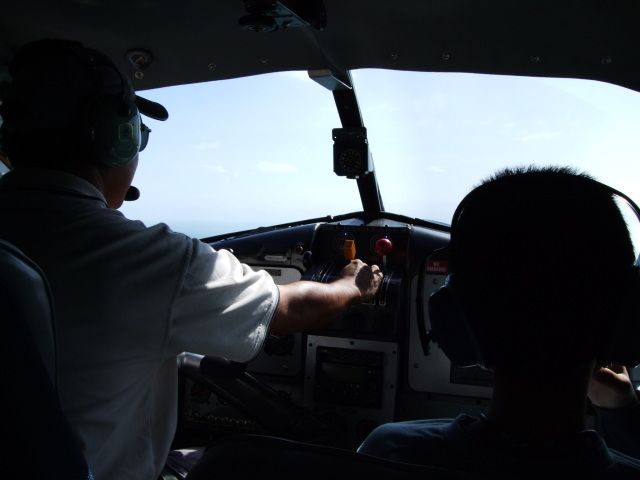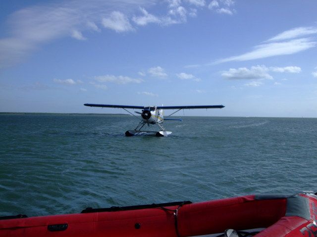 ボートで飛行機乗り場に着くとパイロットに変身。