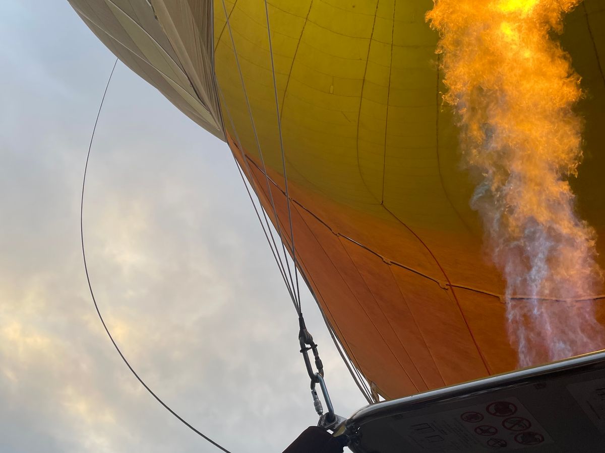 日が昇る前に気球に乗り、気球が上がり始めた頃から空が白み始め、上空に行く頃には明るくなり地上がよく見えすごく気持ちよかったです。天候によって飛行時間は違うようですが、1時間近く飛行したため空の旅は大満足でした。