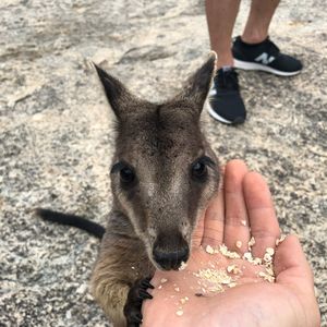 車での移動で、最初の方に山道があり、酔いやすい私は少し気分が優れませんでした。乗り物酔いしやすい方は酔い止めをあらかじめ飲んでおいた方がいいかもしれません。が、シェーンさんがとても気の利く優しい方で、ひとりひとりの体調を気遣って下さり、少し酔ったと伝えると途中で止まってくれました。そこで山の新鮮な空気を吸って少しよくなり、再び車に乗ってバリン湖に到着しました。そこではバリン湖のほとりにあるカフェで、お手製のスコーン(ツアーに含まれています)と、紅茶やコーヒー(別料金$4〜)で気分も落ち着きました。少し一人で散歩をしましたが、カフェの周りのお庭がとても華やかで気に入りました。珍しい生き物や、その場所を含め極わずかな場所でしか見られない植物などをシェーンさんの詳しい解説を聴きながら、見ることができました。次にガロ・チーズ工場の前に少し変わったイチジクの木を見に行きました。どのように変わっているかは実際に見て確認してほしいので書かないでおきます。そしてチーズ工場では、テイスティング、という名目が少し控えめに感じるくらいのたっぷりチーズと、かわいらしいチョコレートを1粒づつ試食させていただき、わたしはこの時点で結構お腹に満足感があったので持参したお昼は食べませんでしたが、お店では本格的な料理を食べることも出来ますし(オプションでお昼ご飯をつけている方はここで好きなメニューを選んで食べます。)持参したものを食べる場所も手配してくれます。工場で家畜として育てられている動物達と、どこまでも続く(大袈裟ではなく)広い高原の景色を見た後、ヤンガバラという村のジェフさんのお店を訪れ、新鮮なトロピカルフルーツと、いろいろな味付けがされたピーナッツの試食をしました。先程書きましたが、すでにチーズでお腹が膨れていたわたしは、その試食でいよいよ本格的に満腹になりましたが、それでも食べてしまうくらいどちらもすごく美味しかったです。平日の昼間だったので人が少なかったですが、何人かの方が結構な量のピーナッツを買いにこられていたので、地元の方にも愛されているお店なんだと思います。ピーナッツとチョコレートのペーストや、アイスクリーム、ちょっとしたお菓子なども売られており、貧乏旅行でなければたくさん買っていたと思います笑 その後、グラナイト渓谷でワラビーたちに餌付けをしました。悶絶する可愛さでした。連れて帰ろうかと、半ば本気で思ったほど。爬虫類や、鳥、馬、なども間近で見られるので動物好きの方にはたまらない時間になると思います。たっぷり動物達と触れ合ったあと、(わたしのときは)ワイン工房の前にコーヒーのお店に行きました。コーヒーの飲み比べと、色々な味のチョコレートの試食は、どちらも大好きな私にとっては至福の時間でした。ここのコーヒーは、日本で飲むコーヒーに比べて酸味や苦味が少なく、すっきりとした味で、それでも香りはしっかりしていて、とても飲みやすかったです。チョコレートは辛いものなど変わった味もあり楽しめました。お店の中は独特の雰囲気があり、おしゃれなもの、変わったものが沢山売られていました。最後に行ったのはワイナリー。フルーツのワインやリキュールをテイスティングしました。ワインにはあまり詳しくはないのですが、甘くて飲みやすく、美味しかったです。大自然とその産物をたっぷり楽しむことが出来るツアーだと思います。どれも本当に貴重な体験で楽しく充実していましたが、充実感や楽しさの大部分は、日本語が堪能で、親切でフレンドリーなシェーンさんのガイドがあったからこそだと思います。人に教えたいけど教えたくないような、でもやっぱり多くの人にぜひシェーンさんと出会って素敵な体験をしてもらいたくてこのレビューを書きました。またぜひこのツアーに参加したいと思っています。