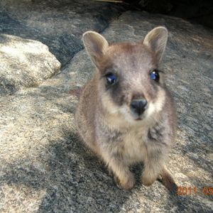 次ぎのポイントは「グラナイトゴージナショナルパーク」キャンプ場があり、バンガロー(日本と同じタイプ)もある。レセプションの事務所の横を下ると一面の岩場。ここのワラビー君たちがたむろしている。エサを差し出すといっせいに寄ってくる。おなかの袋に赤ちゃんワラビーをいれているのもいる。可愛いーけど痛い。爪が鋭くてー<写真5>。