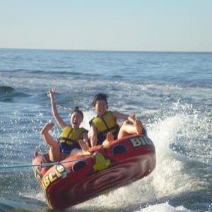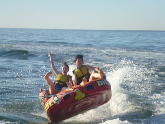 最後のバンパーチューブライドは、むちうちになるかも?と思ったほど激しかったです笑 ソファーのような形の、持ち手のついたゴムボートを船でひっぱってもらうだけなのですが、船が左右に動くとゴムボートはバッシャンシャン浮き上がりながら引っ張られていき、ものすごく揺れました。二人の頭がぶつからない様にするのに注意しないといけません。