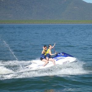 ホテルに向かえに来てくれ、港につくとすぐに船に乗り、ある程度沖まで行って、ジェットスキーの操作に関する説明を受けて、乗ります。