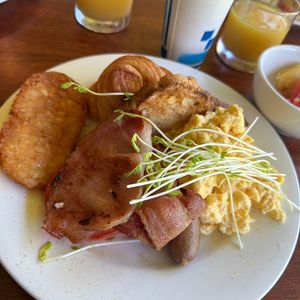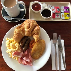 朝ご飯はフルーツ盛り合わせとベーコンやスクランブルエッグ、クロワッサン、トースト、フラットホワイトやジュースなど盛り沢山でした。
