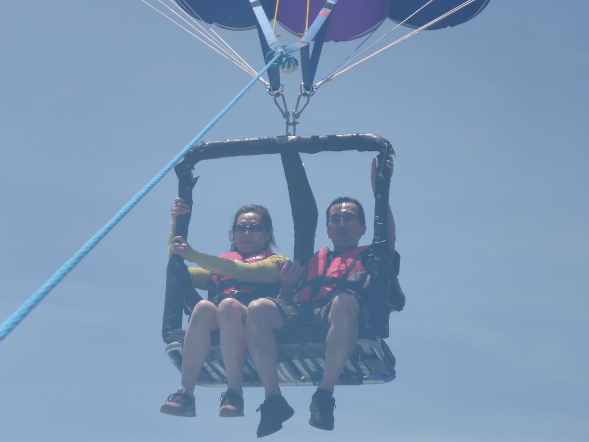 グリーンアイランドでのオプショナルツアーで申し込みました。あっという間に海上50メートルに飛び上がり、360度の水平線パノラマに感動しました。10分間の体験ですが、最高でした。デジカメを渡され、写真をデータで購入できました。