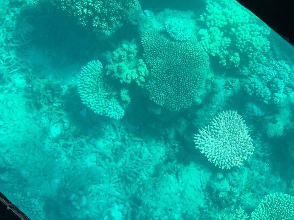 さて、肝心のサンゴ礁見学はと言えば、熱帯の海とは違って、カラフルさはあまりない。カメがいる場合もあるらしいが、ほとんどの場合は色味に欠けた魚ばかり。天気の良い1日ではあったものの、写真のような景色は望めず、それはヘリなり飛行機に乗って、それも海の綺麗な日だけのことのようで。