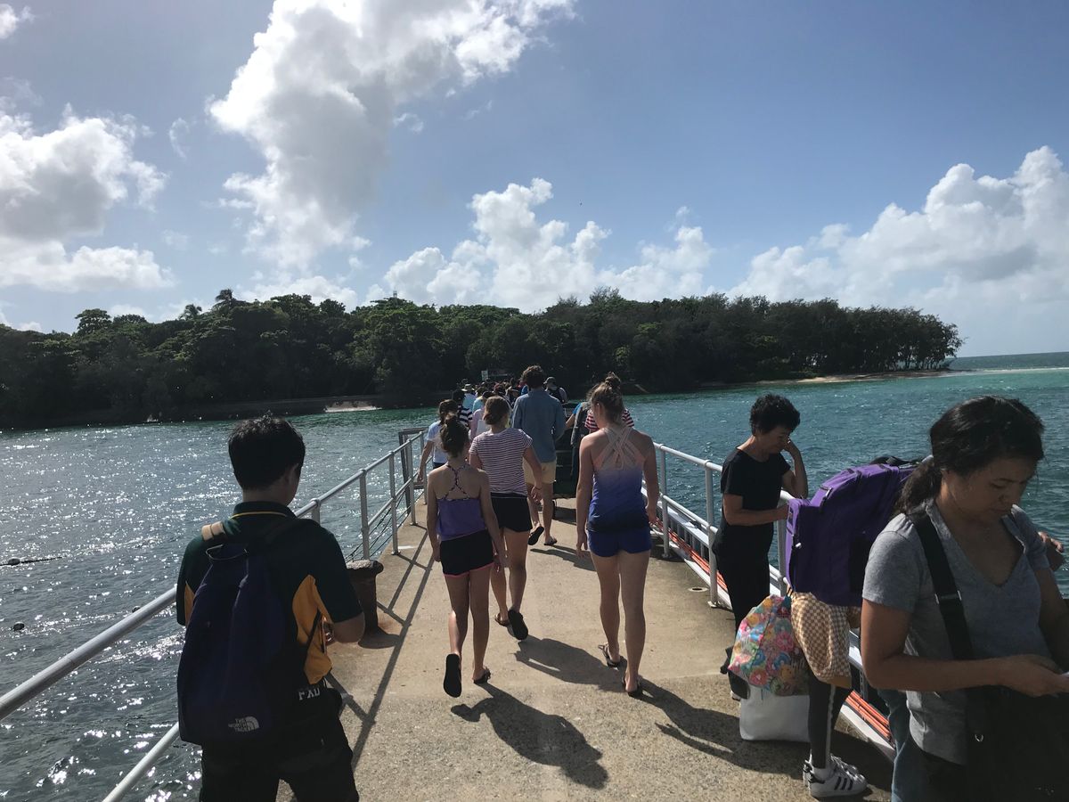 12時半にリーフ・フリート・ターミナルに行きバウチャーを見せてチェックインしました。簡単なやり取りなので英語が苦手でも問題ありません。出航する番号を教えてもらい船がやってくるのを待ちます。ちょうど私がグリーン島に行ったときは、2週間毎日雨が降り続いていたそうで、当日もかなりの強風でした。チェックインカウンターにもrough conditionと記載されていました。その通り、45分間上下左右に揺れ続けました(笑)事前に日本から持ってきた酔い止めを飲んでいたのですが、気分の悪さはありました。普段乗り物酔いをしない主人でもトイレに駆け込んでしまうほどでした。様子を見かねたスタッフの方が、一番揺れの影響を受けない席に案内してくださり、到着まで横になって過ごしました。グリーン島に到着後、シュノーケルセットを借りてビーチに向かいました。後で知ったのですが、シュノーケリングのポイントとは反対のビーチでシュノーケリングをしていたため、あまりサンゴやお魚を見ることができませんでした。また雨の影響か海水も砂が舞っていました。しかし、終盤に桟橋の近くにたくさん人がいることに気づき向かうと、小さなお魚の大群を発見できました。間近でお魚を見れたことで、船での気持ち悪さも吹っ飛びました!16時半がグリーン島出航の最終便なので、シュノーケリングしかできなかったのが心残りです。次は午前中から行きグリーン島散策も楽しみたいです。帰りの船では早々に眠ってしまったので気持ち悪さを感じることなく帰れました。