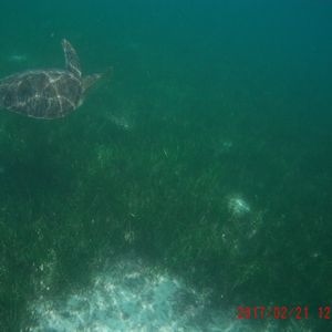 シュノーケルで沖まで泳ぐと、なんとウミガメと一緒に泳ぐことができました。