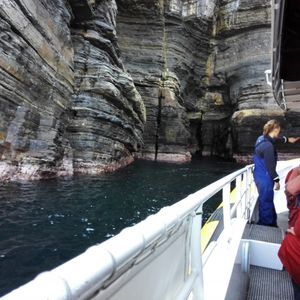 高速船での3時間クルーズ、見ごたえがあり、興奮しました。雨がちでしたが、乗船するころには曇りとなり、柱状節理の崖・奇岩群、イルカ(背中しか見えず)、アザラシの繁殖地など、見どころを次々と案内していただきました。乗船地でのマフィンとコーヒー(10時)、ハンバーガーとかぼちゃのスープ(遅いランチ)もおいしくいただきました。