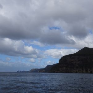 クルーズはタスマン半島迄バスで1時間30分位行った処で降りて、レストランで珈琲、紅茶にケーキを頂いた後でした。そこから徒歩でボート乗り場へ行き乗船します。若い船長さんのジョークで盛り上がったところで出港。お天気に恵まれて、凪ぎ状態でポートアーサーを海上から眺めた後、切り立った海岸線、アシカ&赤ちゃん、イルカ、大きな海鳥が観れました。今回は鯨の汐吹などが観れて本当にラッキーでした。