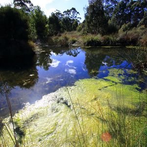 クルーズが終わりオプションのタスマニアデビルのUnZooへ。到着したときちょうど餌やりの時間だった。一見かわいいが、餌を見たとたん本当にデビルに変わる。歯をむき出し、骨までバリバリと砕く。デビルだけでなくカンガルーや他の動物も居て楽しめる。また、アーモンドの花が咲き、小さな沼が藻の模様とともに、空が映されきれいだ。