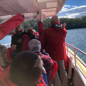 バスの中の人が全員ポートアンサーだったので、終日一緒でした。クルーズに乗り酔い止めを貰っての出発でしたが、防寒着は足元まであり、天候も良く暑いくらいでした。船の中では移動は出来なかったけど、ポイントで船を止めて移動して写真を撮ることが出来ました。止まっている時も回転させてくれたので、左右に移動する事もなかったです。チェックインの時にランチと飲み物の確認をしたので席に着くとセットされた袋に名前があり自分の物を取って食べました。