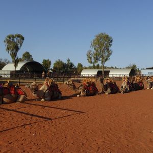 ファームに着いてからは、スムーズに案内され、自分の乗るラクダが紹介されます。ラクダは10頭くらいで1チーム。先頭のラクダにスタッフがのり、サイドにも歩きのスタッフが付き添って、英語で解説が続きます。ファームの周りの丘を超えると、ウルルが見えてきます。夕陽の沈むちょうどの時刻に、ベストな場所で止まり、1頭ずつ写真を撮ってくれました。ラクダに揺られて、ウルルのサンセットを観る経験は、他ではできないすばらしい経験でした!