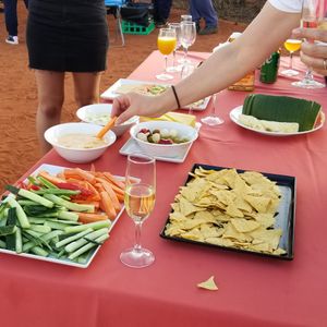 ウルルはハエが大発生で、とにかくネット無しではいられませんでした。夕焼けに輝くウルルの美しさは期待以上のものでした。ほんの1〜2分でしたが、束の間の自然美に感動しました。待ってる間に生野菜やフルーツを振る舞ってもらい本当に美味しくいただきました。星空は無かったけど、お料理は思いの外美味しく楽しいひと時でした。キングスキャニオンは遠く、朝の4時出発し、3時間半バスに乗り36度の中をトレッキングなんて景色も良かったけど、もう二度と出来ない体験でしょう。