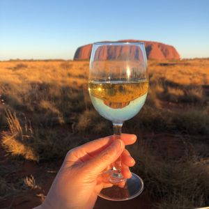 その後、サンセット。スパークリングワインに写る逆さエアーズロックと記念撮影!