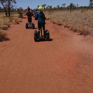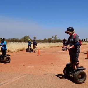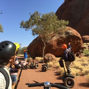 エアーズロックの駐車場に到着すると早速、肘、膝当て、ヘルメット、日本語ガイドセットを着装し、始めて見るセグウェイの練習、英語の説明 見よう見まね乗ると簡単に乗ることができ30分ほど簡単なコースで練習すると皆さんそれなりに乗れるようになり午後12時頃出発。