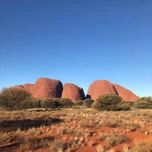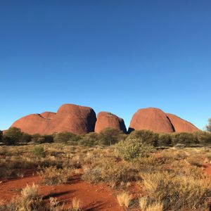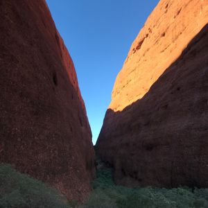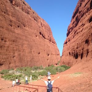 エアーズロックばかりフューチャーされますが、カタジュカ散策も面白いですよ。岩肌の茶色、木々の緑色、空の青色のコントラストが綺麗な場所です。道は舗装されておらず、両脇に置かれた石を目印に歩きます。この石が結構アバウトで、なんとなくで歩きましたが無事奥にたどりつけました。