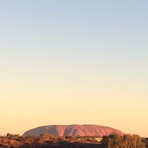 たくさんの頭という意味のカタジュタは車窓から見ているうちにすごい迫力で迫ってきた。バスから降りると岩の間、雲ひとつない空に真昼の月が浮かんでいた。そこを散策。風が吹くとかなり寒いが空気が澄んでいて心地いい。奥に歩いていくと少し前に降った雨で水たまりができていた。ガイドさん曰くラッキーとのこと。そう、岩の間と空のV字がみごとに水にうつり、逆さV字を見ることができた!いつまでも見ていたいと思うほど綺麗だ。後ろ髪を引かれながら引き返してくる。パワーをもらい、次は念願のウルルサンセットへ。 サンセット会場では、シャンパンとおつまみが用意されていた。シャンパン片手に色の移りゆくウルルを眺める。ウルルは少し遠くでどっしりと構えている。シャンパンのせいでもあるだろうが、うっとりしてしまう。ウルルは自分も色を変えながら、周りの空の色も変えていく。暗くなったウルルも神秘的で神々しい。別れを惜しみつつバスに乗った。毎日見ていたいと思う絶景だった。