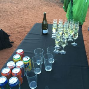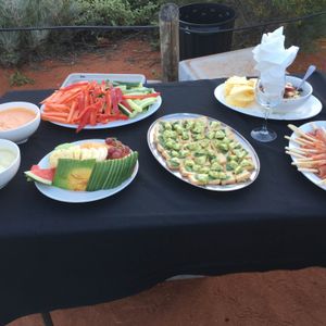 ウルル、カジュタが見える小高い丘に行き、そこでシャンパンやビール、ソフトドリンクなどを配られ自由に飲めました。またちょっとおしゃれな前菜のようなものも沢山の種類があっておいしかったです。