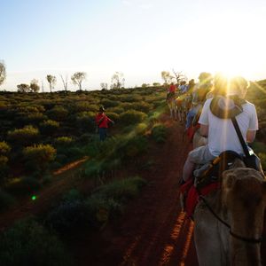 朝日ツアーに参加。12月の夏至近かったので、ホテルを4:30ピックアップ。英語説明の後、5:30頃からラクダに乗り、エアーズロックとカタジュタを左右に遠望しながら、準砂漠の平原を1.5時間程、悠然と散策した。多少のアップダウンもあるが大半は安定したラクダの歩調で、視点も高く、小学生の子供には好評だった。日本では経験しがたい地平線や、地球のランドマークであるエアーズロックなどをラクダから眺める体験は、自分が今、地球にいるということ以外、いつの時代のどこにいるのか、一瞬分からなくなるような貴重な体験となった。