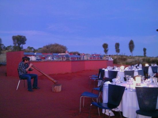 現地日本語説明員の方から説明を受け、ワイングラスにワインが注がれたものを、エアーズロックにささげて見たところ、エアーズロックが上下さかさまに!写し出され感激。夕日に染まるエアーズロックを前に、家族3人でアボリジニに乾杯した気分で、なんとなく幸せな気持ちになりました。