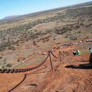 8時、最初のウルル登頂に挑戦のために登山口に向かいましたが、強風のために閉鎖されていました。麓めぐりをしてから、9時に二度目の挑戦でしたが、強風のため閉鎖してました。文化センターを見学後、10時に最後の挑戦に登山口に向かいましたが、やはり閉鎖でした。しかし、入口付近で写真を撮っていると、レンジャーがどこからともなく現れて、ゲートをオープンしました。ツアーに参加していた人たちみんなが興奮状態で、一斉に登りました。とても急な坂道で、息切れはするは、鎖を持っている手にも力が入り、鼓動が激しくなりました。振り返り景色を見ると何とも言えない感動的な風景が広がっていました。晴天で、カタジュタの岩郡もはっきりと見えました。