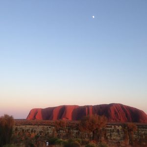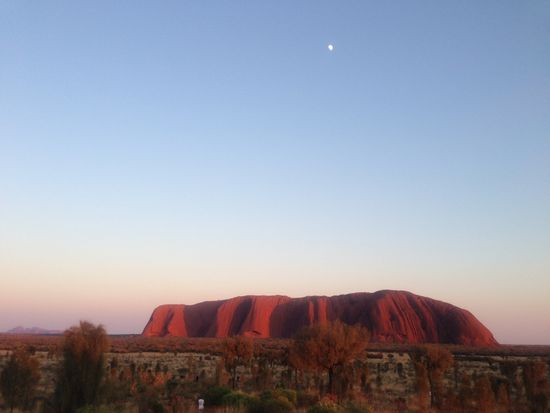 最初はまだ月が出ている時間から、太陽に照らされて、段々と赤く色付いていくウルルはとても綺麗でした。