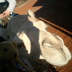 私たちは、とてもおとなしくてキュートな男の子ラクダにまたがって、トコトコとエアーズロックとマウントオルガを望めるポイントへと影を9つほど連ねて進みました。