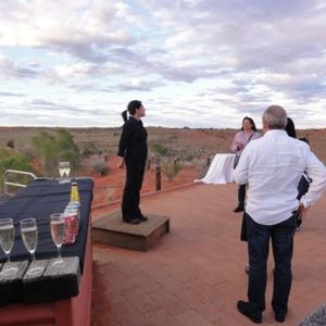 夕日を見る専用の小高い場所で、立った状態でのエアーズロック鑑賞でした。ですが、その時にシャンパン1杯だけのサービスかと思ったら、シャンパンは飲み放題状態で、シャンパンの飲めない人にはビールや、お茶みたいなのも振舞われていましたし、軽食として、カナッぺみないなものも食べれて、その中にはカンガルーの肉ののったものや、クロコダイルの肉ののったものもあり、おいしかったです!!