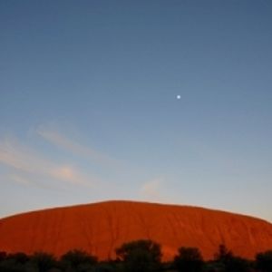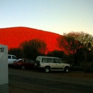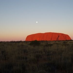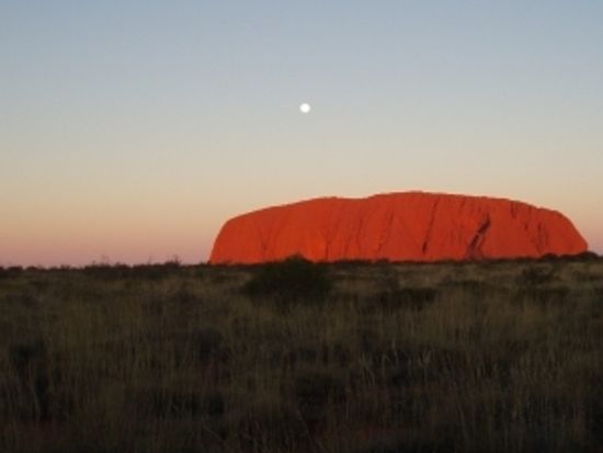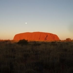 初めてのウルルに行ってきました!5時頃にホテルでピックアップしてもらい、車で移動。途中、事前にお金を払っておいた「国立公園入園チケット」を、入り口の警備員さんに車の中から振って見せた後、しばらく車で走るとついにウルルが見えてきました。車窓から見る初めてのウルルの大きさにビックリしてましたが、夕焼けを見るポイントに到着すると、ますますあの大きな山が1枚岩なんて信じられない!って位に大きく見えました。夕焼けポイントはかなり広く、色々な団体ツアー用に所々で場所取りしてありました。最初私たちのポイントに着いた時、私たちともう1組の熟年日本人カップルしかいませんでした。ガイドさんに他のツアー客も来るからもう少し待っててと言われ、待っている間にベストポジションでゆっくり2人で写真を取ることができました。なんだかウルルをよく見るとパンケーキのような岩の上に白い丸いものが光っているではないですか!その日はなんと偶然にも満月だったのです!5分おきに写真を撮ると岩の色が夕焼けで変わっていくのが分かるよ、とガイドさんに教えてもらったので、思わずウルルと満月の写真を取りまくってしまいました。しばらく写真を撮るのに夢中になっていたら、他のツアー客もやってきたので、みんなでシャンパンで乾杯をしました。チーズとかピクルスなどの軽食を食べながら、シャンパンを飲み、ウルルの色がどんどんホットケーキの濃い色から黒に近くなっていくのを見ていました。後から来たツアーの人たち(カタジュダとの組み合わせかな?)は、混んだスペースで順番に写真を撮っていくのに必死になっていましたが、私たちは先にたくさん撮ってたので、シャンパンもゆっくり飲めてよかったです。シャンパン片手にウルルの夕焼けを見るなんて、気分的にはかなりリッチでうっとりでした☆