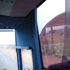 バスの中では、ガイドの方がウルルについて、いろいろ説明してくださいました。また、バスのドライバーも日本語が話せる方で、ガイドと運転手との掛け合いもおもしろかったです。そんななか窓の外を見ていると、暗闇の中から徐々に明るくなっていく中に、ウルルの1枚岩のシルエットをみることができます。