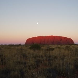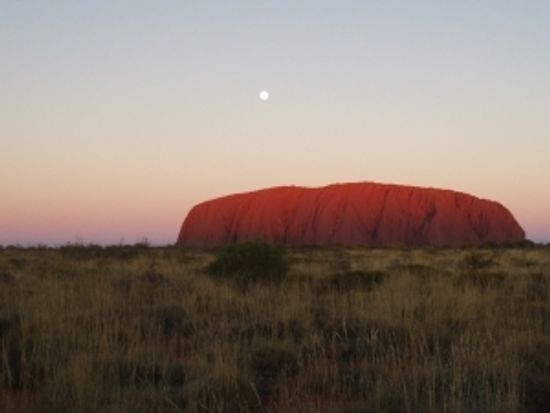 まだ仄暗い中、ウルルのサンライズビューポイントへ。うっすらと色づいた空に真っ黒いシルエットとなって浮かび上がるウルルもまた幻想的です。サンライズビューポイントは、サンセットのポイントに比べ、ぐっと近く、迫力があります。後ろから陽が昇るにつれ赤く染まってくるウルルは圧巻。ちょうど月もくっきり見え、絵のような光景でした。
