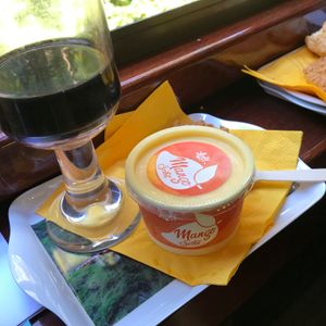 帰りは列車に乗りました。アップグレードしましたが、おつまみ(山盛り)とお酒やアイスまで出て、席もゆったり。このアップグレードは有効でした。