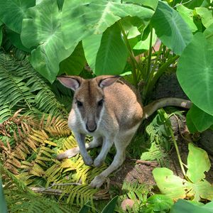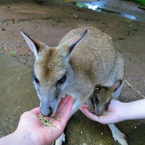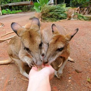 その後は動物園でしばらくフリータイムです。ゆっくり回って1時間ぐらいです。入り口で2A$でカンガルーの餌を買えます。結構たっぷり入っていますので、家族で一袋で適量でしょう。園内で柵なく放し飼いされてるカンガルーやワラビーに手づから餌やりができます。娘は少し腰が引けていました。