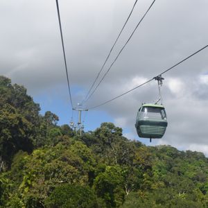 今回はホテルにバスで送迎があり、スカイレールでキュランダへ。スカイレールは思いの外高い視線。世界遺産の原生の熱帯雨林の上を通ります。途中バロンフォールの見える場所を通過しますが、なぜか通過だけ。その理由はあとでわかります。