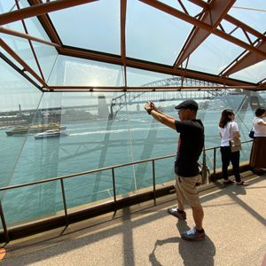 本当はブルーマウンテンのツアーに申し込んでたのですが、山火事の影響で中止になり、振替の別ツアーも催行日が合わないということで途方に暮れてました。オペラハウスに向かってた時に、ハーバーブリッジを上っている人たちを見た子供たちが、あれをやりたいということで、急遽前日に申し込みました。結構なお値段のため、当初は子供2だけ登らせようかと思ったのですが、やはり英語等含めて不安だったので僕も一緒に3人で登ることにしました。当日は10人のグループで、日本人はうちら3人だけでした。器具の装着、帽子やハンカチ音装着、ヘッドフォンの装着、すべてがシステム的でスムーズにいきました。道中は安全ワイヤーを着け、一列になって進んでいきます。ガイドとは離れてますが、ヘッドフォンで話していることが聞こえてくるので全く問題ありませんでした。一部下が見えるところを歩く時だけ恐怖感がありましたが、下が見えない部分はさほど怖くないと思います。子供たちとの記念の写真ができて、本当に良かったと思います。