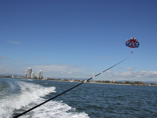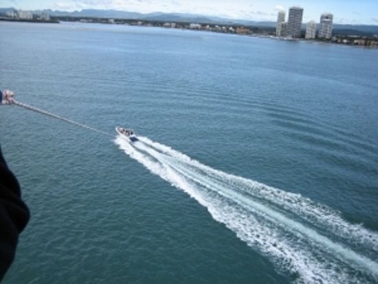 もともとバイク好きだというオーナーさんの嗜好らしく、エンジンは高回転高出力型の2スト。これだけでもかなり期待大で(自分も元バイク乗りなので)したが、その期待を裏切ることなく、実にキレのいいスピード感を存分に味わいました。30分って少ないのかなぁと思いましたが、意外と十分に走りをエンジョイできたと思います。他にもパラセーリングをやりましたが、これがまた実にいい!何がいいかというと、実に安定してるんです。離陸時も浮遊中も。両手離していてもつい居眠りしたくなるぐらい、そのぐらい快適で気持ちいいGoldCoastの空中遊泳でした。またぜひやりたいです。