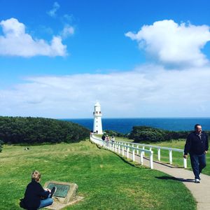 昼食は灯台のある景色の良い丘の上でいただきました。オージーバーベキューはソーセージ2本に付け合せのグリーンサラダ、マカロニ、玉ねぎのソテーをワンプレートに乗せるスタイルでした。
