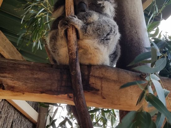16:20コアラ保護センター到着。コアラが下まで降りてきて、食事をしていた。間近で動くコアラが見られて本当によかった。ほとんど寝ているコアラが動いているのを見られたのは運がよかったとしかいえない。現に動いていたのは1頭だけで、その他のコアラは高いところで寝ていたり、おしりを向けて低いところで寝ていたり。コアラに関する展示もしっかりされていて、いろいろ考えさせられるところだった。