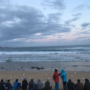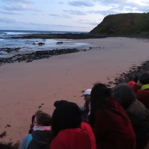 17:00ペンギンパレードのチケットを受け取り、出発。日が沈んで行く大自然の中、移動。野生のワラビーをたくさん見かけた。17:40到着。ペンギンパレードは18:30~と聞いたので、18:00まではお土産を見たり、トイレに行ったりして備えた。30分前には行くとよいと言われていたのだが、20分前ぐらいになり、人混みの間をぬって海岸の席に腰をおろした。冬は風が強くて、とにかく寒いので、防寒をしっかりしていくことをおすすめ。18:30過ぎから、5〜10匹のリトルペンギン集団があちこちから現れた。海から上がってくる姿を見るには、海岸の席まで行く方がよい。海から上がって、岩場を越えて、集団が揃うと、よちよちだが早足で砂浜を抜けていく様子はかわいくてしかたない。25分くらい見て、入り口に戻る。入り口に戻る道中も海からあがったリトルペンギンを間近で見られた。小さくてとてもかわいい。ここまで来ないと見られないリトルペンギンは必見。入り口に戻ると、集合時刻まで少し時間があったので、トイレに行ったり、あたたかくなるものを買おうとしたりしたが、人の多さに断念せざるを得なかった。体がかなり冷えていた。