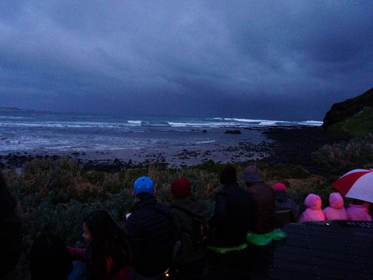 ビジターセンターに到着する間際に、大雨が降りました。みんなセンター内のショップでビニールポンチョ(5$)を購入していました。ちょうど第1団のペンギンが陸に上がってきた時には雨が止みましたが、とっても寒かったです。防寒の準備はしっかりしていったほうがよいです。寒かったので、海に面した観客席で見ないで、観客席とビジターセンターをつなぐ通路わきにある巣箱の前で待機していたら、とことこ歩いてきて巣箱に入っていく姿を観察できました。とてもかわいらしくて、ほっこりしました。撮影はNGです。