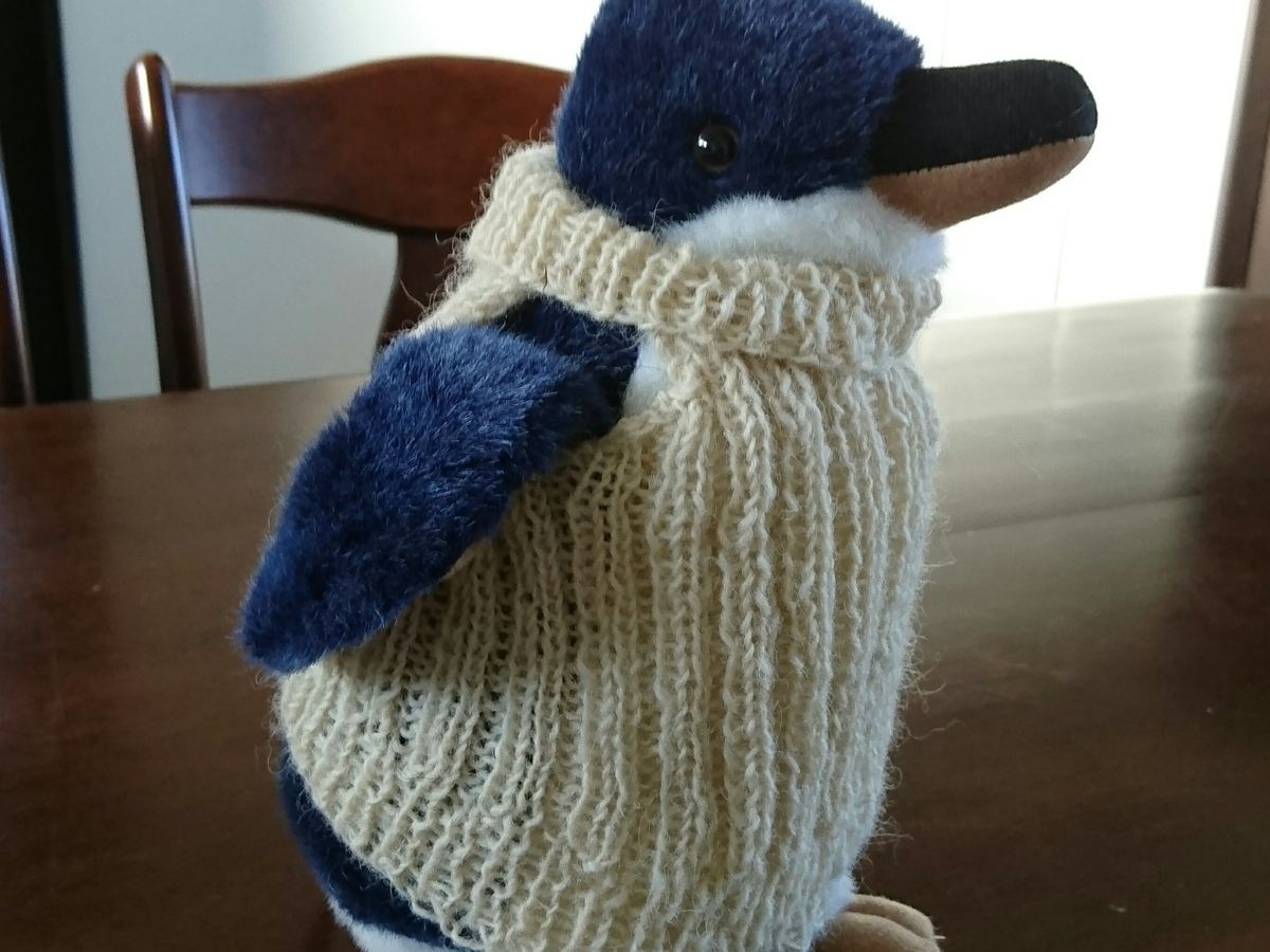 写真が撮れなかったので、お土産にセーターを着たペンギンのぬいぐるみを買ってきました。漁船や工場などから流れでた油から身を守るために、編まれたセーターです。ペンギンの命を守るためのプロジェクト、「penguin foundation」で取り組まれ、オイルが付着し保温能力が低下したペンギンの体温維持と羽繕いをする際に羽についたオイルを飲み込むを防ぐためだそうです。